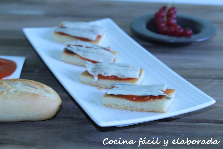 Como os digo en el título no tarda más de 30 segundos. Cortamos el bizcocho en rectángulos pequeños, ponemos un poco de salsa de tomate y encima un par de boquerones en vinagre. Listo, un aperitivo express que os sorprenderá la mezcla del dulce del bizcocho con el vinagre del boquerón.