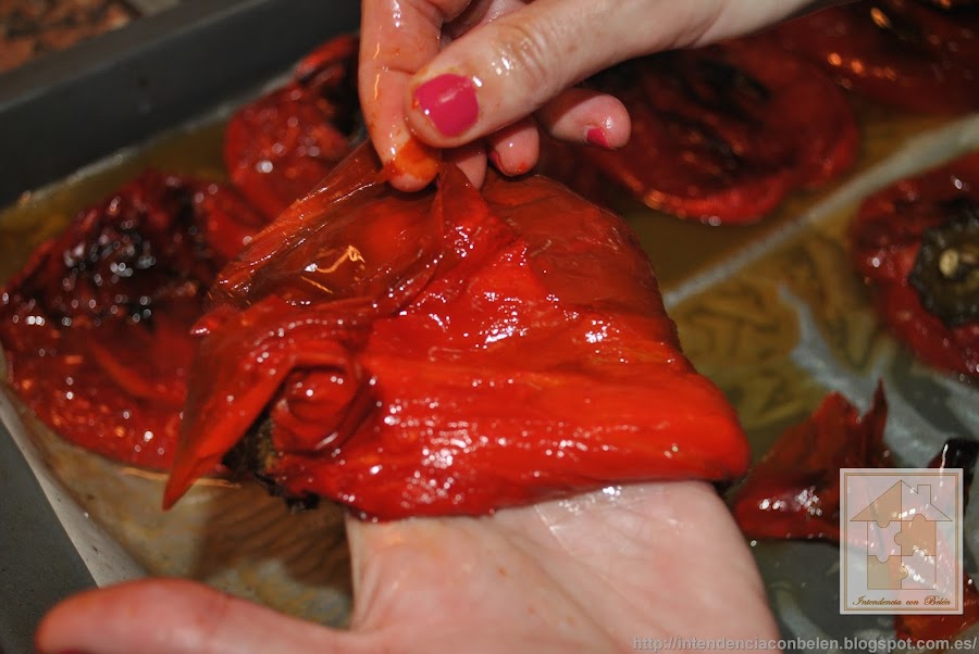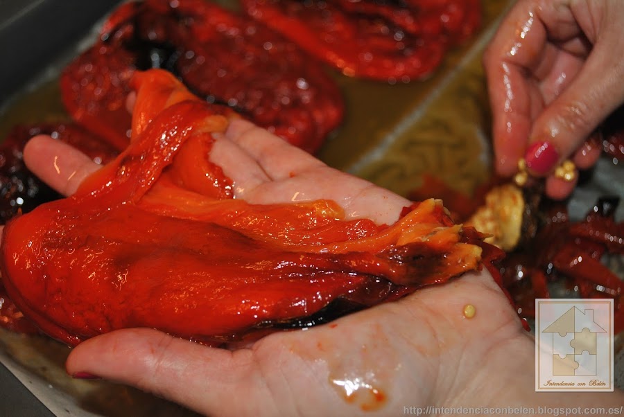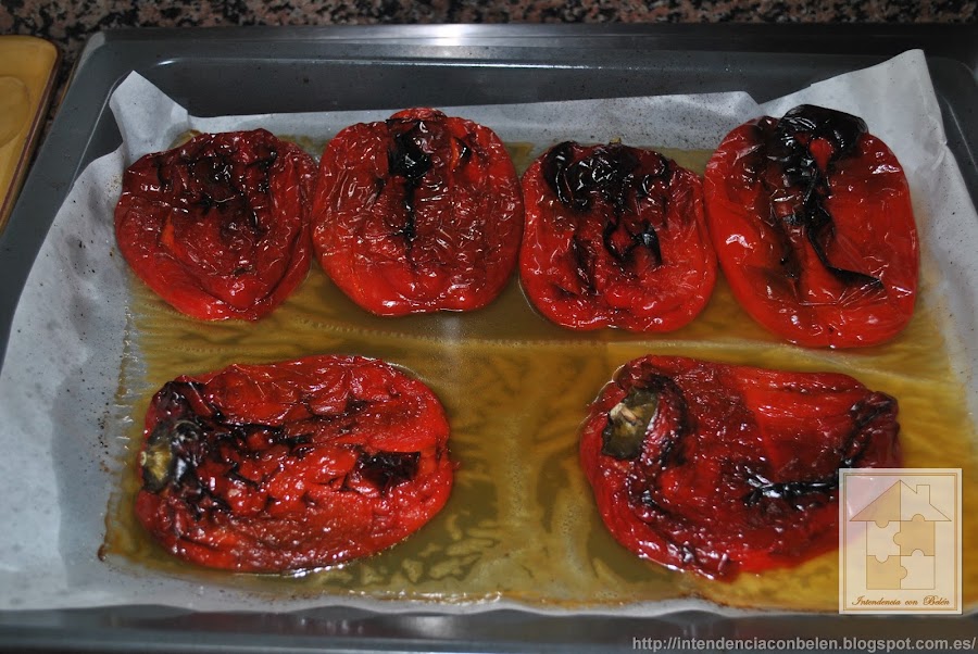 Tendremos el horno precalentado a 200º calor arriba y abajo e introduciremos la bandeja en el mismo hasta que los pimientos decaigan.