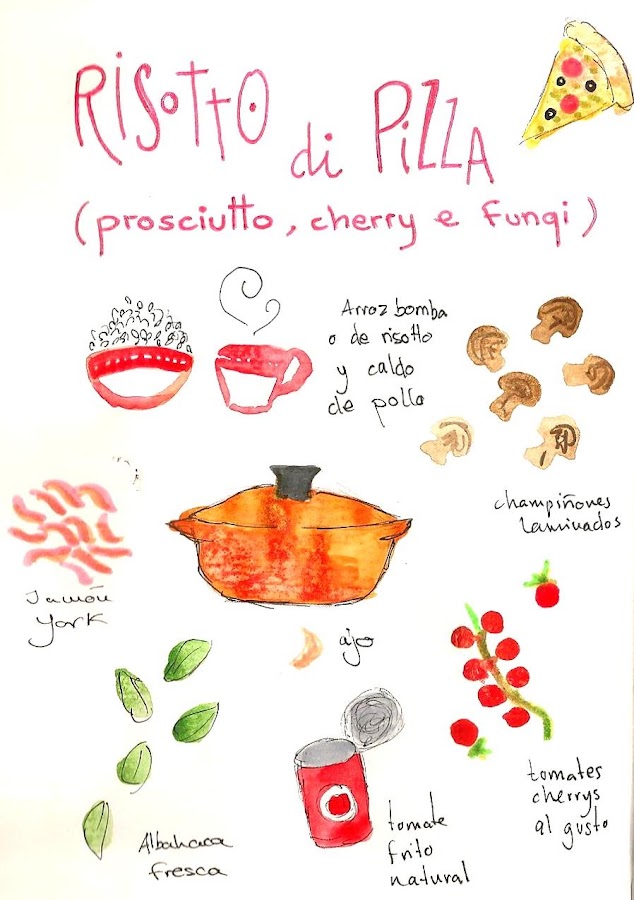2 tazas de arroz bomba o especial para risotto, tomates cherrys al gusto, 200 gr de tomate frito natural, 1 lata de champiñones o champiñones naturales (aconsejado), 150 gr de jamón york, 1 ajo picadito, 1 litro aprox. caldo de pollo (lo que el risotto admita), mantequilla, queso de pizza, orégano y albahaca