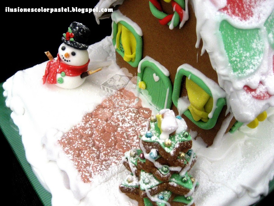 3. Ahora la parte divertida. Cubrimos el tejado con fondant o caramelos y construimos la puerta, ventanas, arbolitos... todo cuanto queramos!! Con el resto de la glasa simularemos la nieve, para ello echar un poco sobre el contorno de las tejas, ventanas, cornisas... si la glasa no desliza añadir una cucharadita de agua para que quede más líquida y rellenar en una manga pastelera desechable nueva.