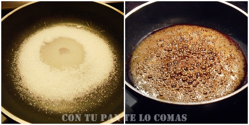 1. Preparamos el caramelo poniendo el azúcar (4 o 5 cucharadas) con una cucharada de agua en la sartén hasta que se caramelice y bañamos el molde del flan.