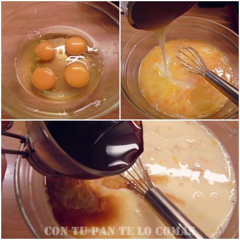2. En un bol batimos 4 huevos y añadimos el bote de leche condensada.