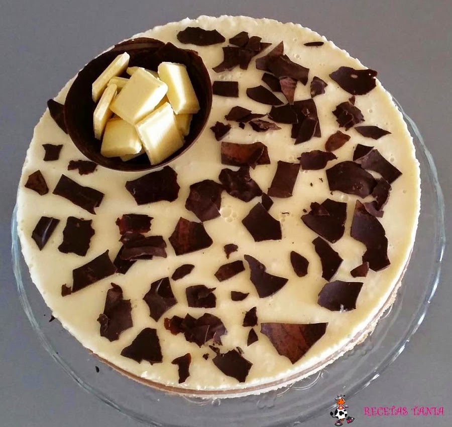 Hacemos lo mismo con la tercera capa que será de chocolate blanco, en un caldero ponemos 333ml de nata (crema de leche) a hervir,esta vez no ponemos azúcar y añadimos el chocolate blanco derretido (baño maría, microondas) cuando empiece a hervir añadimos el sobre de cuajada mezclada en 200 ml de leche,vamos removiendo hasta que vuelva a hervir y cuando esté bien cuajado el chocolate con leche añadimos la ultima capa. Dejamos enfriar,mejor comer de un día para otro que estará más rica.