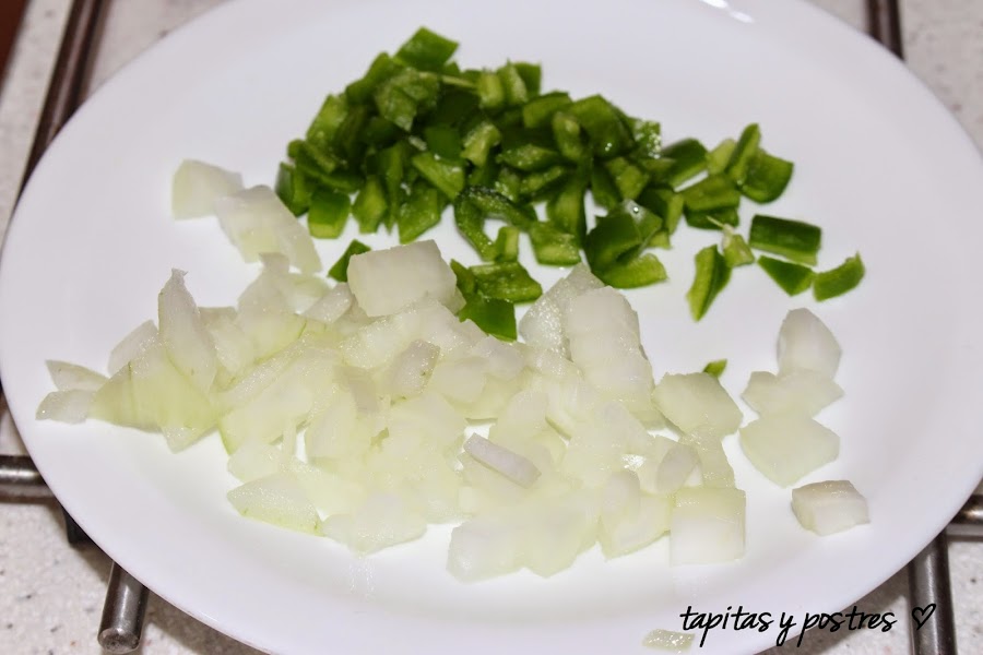 Cortamos la cebolla y el pimiento a cuadraditos.