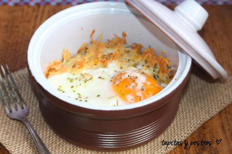 Por último cascamos el huevo encima, salpimentamos y espolvoreamos hierbas secas por encima. Al horno. Unos diez minutos.