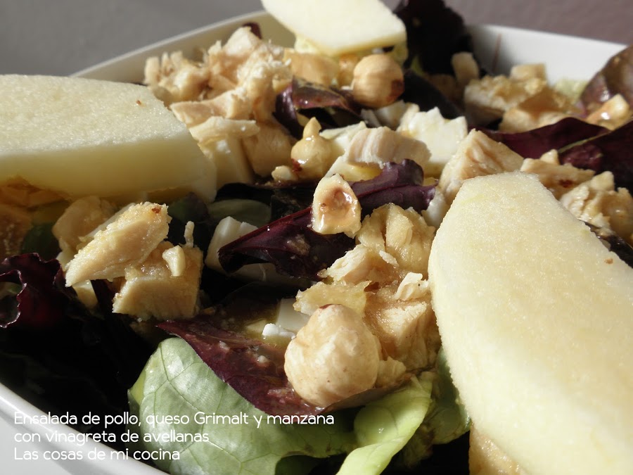 Y por último, desde mi cocina, os propongo esta Ensalada templada de pollo, manzana y queso. La manzana contiene una fibra soluble llamada pectina, que disminuye los niveles elevados de colesterol y regula la glucosa en sangre, por lo tanto, es una fruta segura para los diabéticos. También regula la función digestiva. Comer manzanas estimula el funcionamiento intestinal y esto contribuye a la purificación porque ayuda a sentirse saciado antes y durante más tiempo y puede aliviar el estreñimiento crónico.