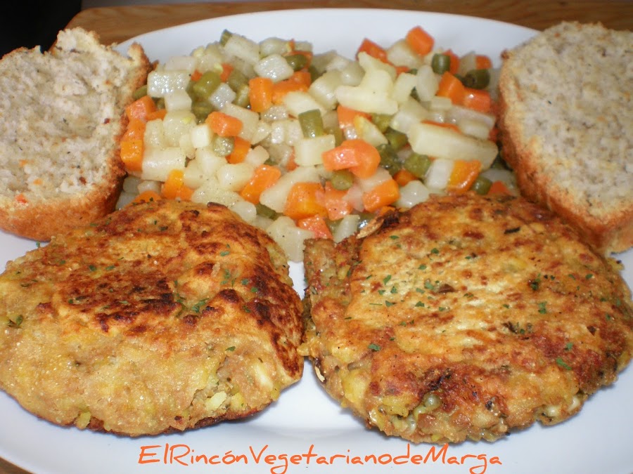 Mezclamos tres cucharadas de harina de garbanzo con un poco de agua y pasamos las hamburguesas por esta masa. Las freímos en abundante aceite caliente.