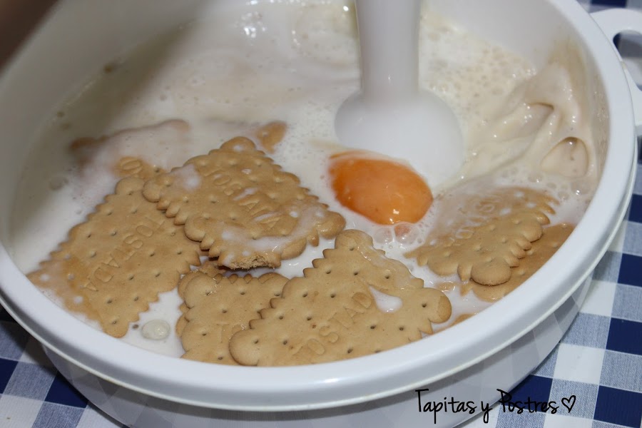 Ponemos todos los ingredientes (huevos, leche, galletas y azucar) en un recipiente.