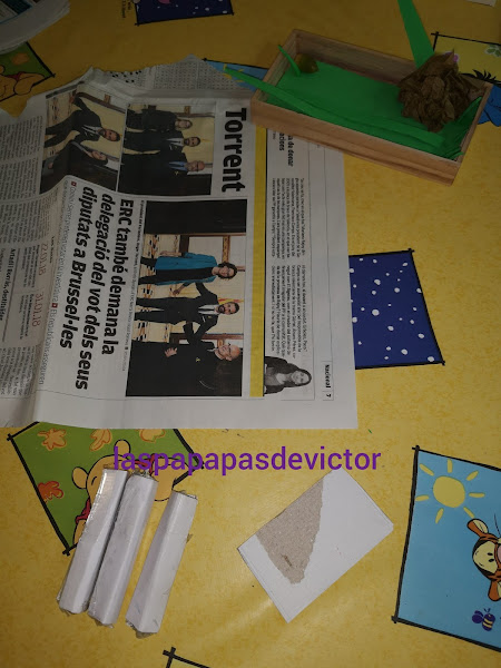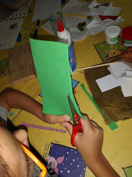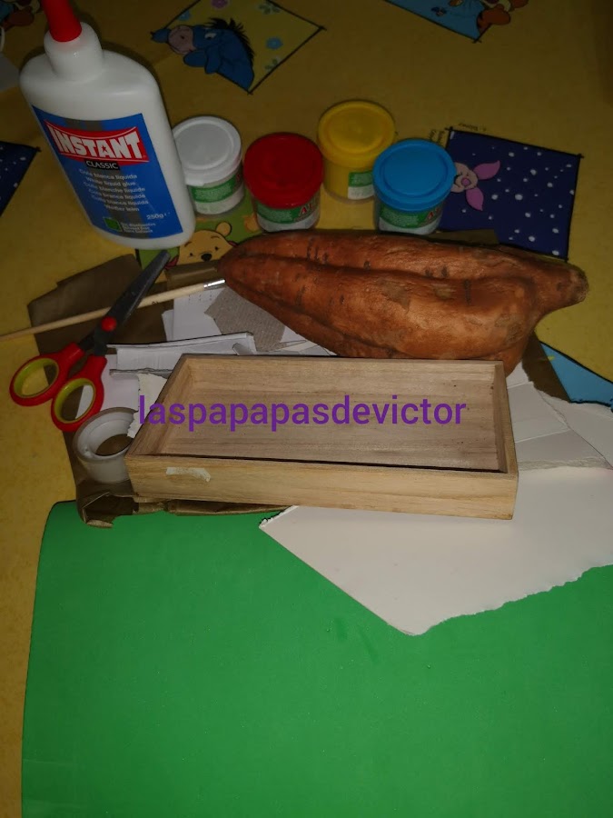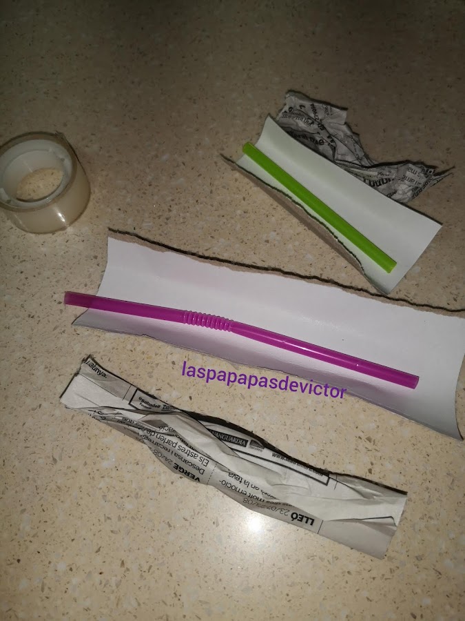 Pajitas, argollas de una cortina, una tapa de una caja de madera de una bolígrafo que me regalon hace tiempo, papel de seda, goma Eva verde y trozos de una caja de zapatos...