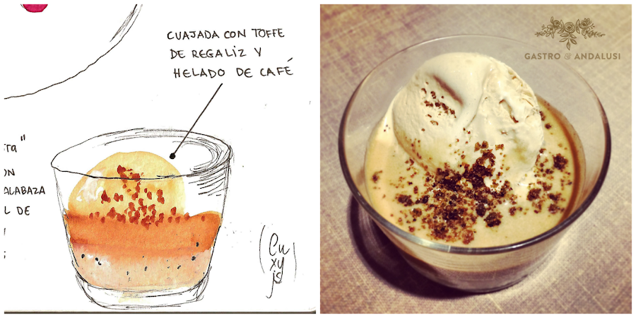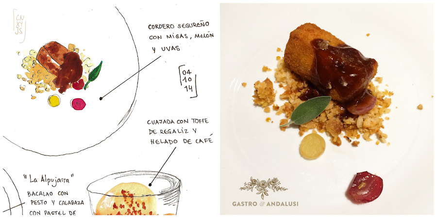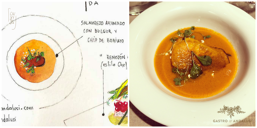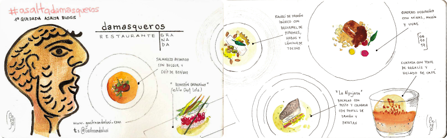 Lola Marín (chef y propietaria del Restaurante Damasqueros) nos elaboró un menú especial para todos nosotros basado en la gastronomía andaluza y granaina, ya que muchos de los asistentes venían desde muy lejos y queríamos que probaran los exquisitos productos que tenemos en nuestra tierra. Lola elaboró un menú "sorpresa" del que no sabíamos nada hasta el preciso instante en el que Santiago Cara nos servía el vino y nos cantaba los platos [Todos los platos fueron maridados por Santi con los vinos granainos de las Bodegas Al Zagal].