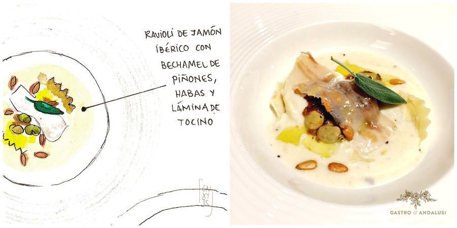 Ravioli de Jamón Ibérico con bechamel de piñones, habas y lámina de tocino