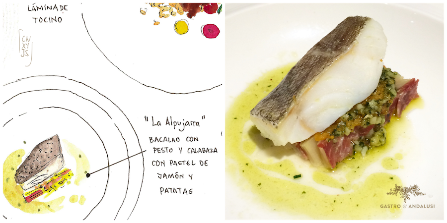 Bacalao con Pesto y Calabaza con pastel de jamón y patatas