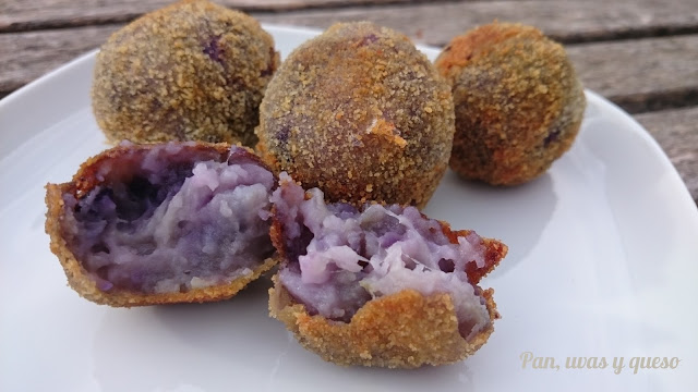 Este aperitivo es vistoso por el color que le da la patata morada, unas bolitas realmente apetecibles que se combinan con el queso y otros condimientos, el toque durado y crujiente se harán irresistibles a la vista de tus invitados.