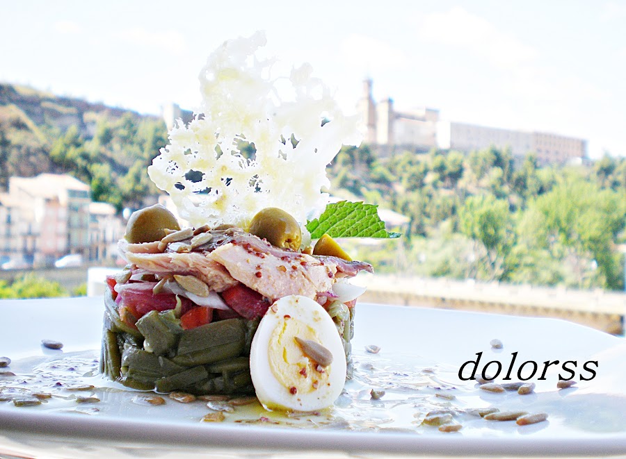 Buscando en el blog de Dolorss, tiene muchísimas, si visitáis su blog seguro que os encantaran todas yo he elegido esta, Ensalada festiva con judías verdes con lomo de atún y peineta de queso, super original.
