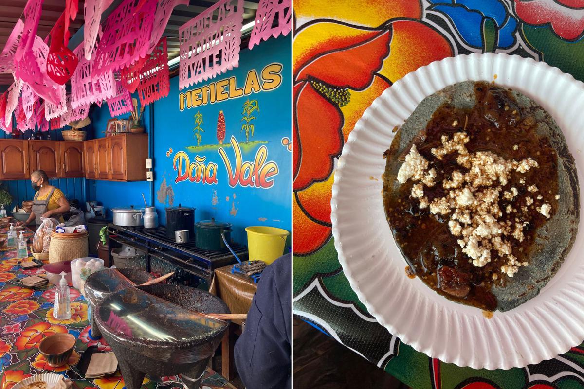 Memelas: Tortilla gruesa dorada a fuego lento que se sirve con salsa molcajetada, queso fresco y carne a gusto. Es originario de Oaxaca y yo la probé en uno de los puestos de comida callejera más emblemáticos dentro del mercado Benito Juárez.