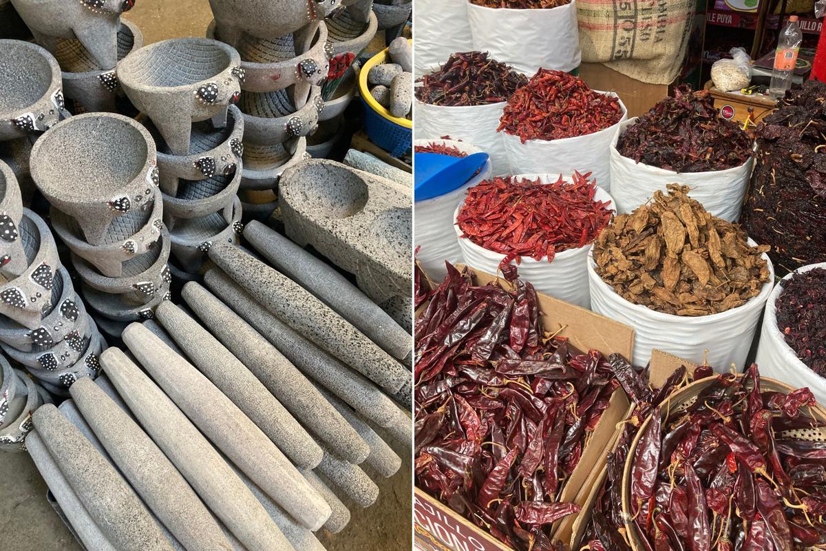 Mercado Benito Juárez (Oaxaca): Ubicado en el centro de la ciudad de oaxaca, este mercado es conocido por encontrar productos de la región tales como artesanías, licores, moles, carnes, pescados todo tipo de chiles, flores entre otros.