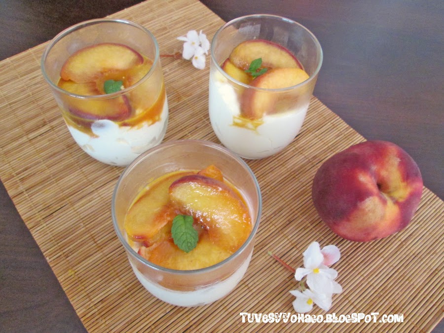 2- Copa de melocotón y crema de queso -Tuvesyyohago . Este es un postre rápido y muy fácil de preparar . Perfecto si tienes visitas improvisadas . +Blanca Arias de Tuvesyyohago nos indica como hacerlo . Hay que preparar una base de crema de queso al que añadimos los melocotones macerados en cítricos . A que suena genial ? receta completa de las copas de melocotón sencillas