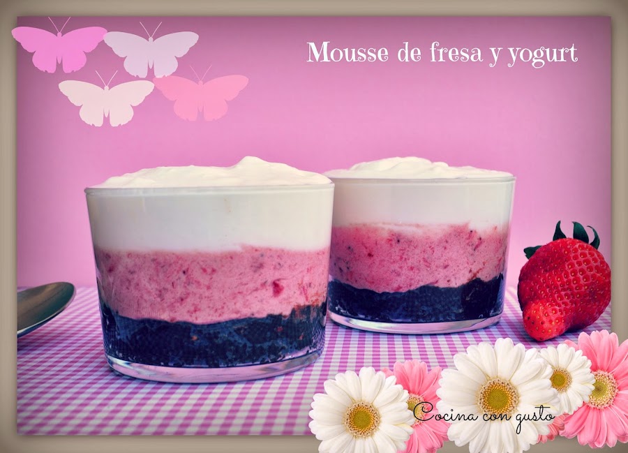3- Mousse de fresa y yogur . CocinaconGusto Que mejor que usar la fruta de temporada , como ha hecho +Leire - Cocina con gusto . Este postre es una delicia , la base es de chocolate . la capa media de una mousse sencilla de fresas y para rematar la mousse de yogur natural . Si no tienes fresas usa la mermelada que más te guste . Un postre sencillo , elaborado a base de nata (crema de leche) y gelatina . Más fácil imposible .receta completa de las copas de mousse de fresa y yogur