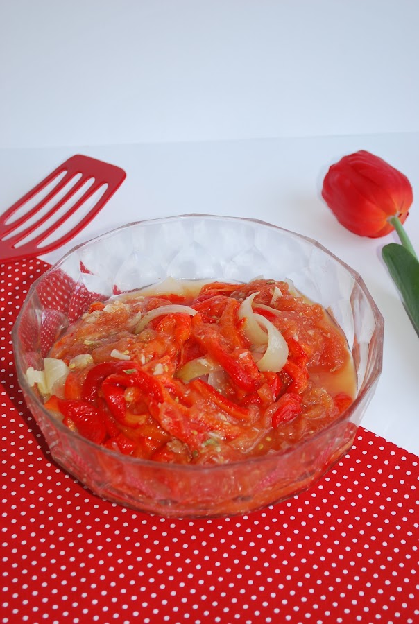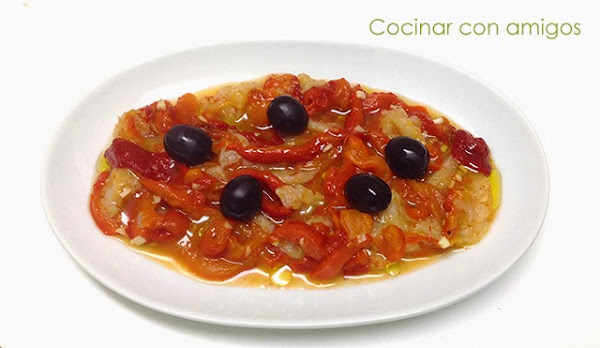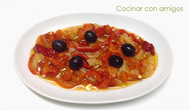 Pensando en plato único tenemos esta deliciosa ensalada de pimientos con bacalao que nos trae cocinar con amigos, como recomienda su autora... tiene que estar de toma pan y moja!!