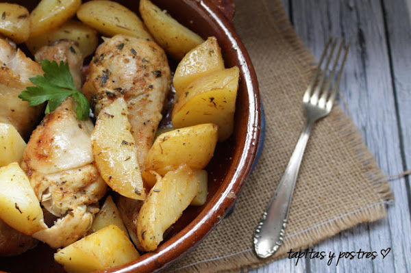 Lo bueno de esta receta es que se asa todo el pollo dentro de una bolsa de asar y las patatas también en bolsa de asar, con lo cual no manchamos apenas nada. Se hace con especias como: curry, pimienta blanca, tomillo seco, orégano, ajo y cebolla en polvo, pimentón, perejil seco...Muy sencillo para hacerlo cualquier día que mientras esté en el horno podamos hacer otras cosas y aprovechar el tiempo. Genial. Todo al horno y en 1 hora están las patatas y el pollo perfecto para sentarse y empezar a probar esta rica receta.