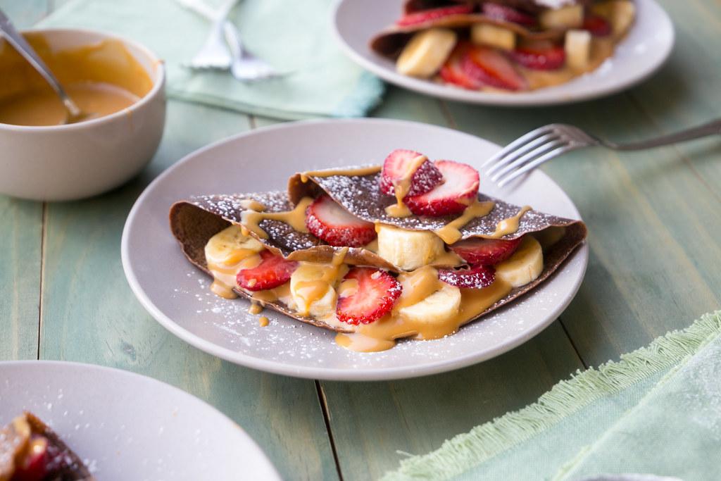 2. Crepes de chocolate rellenos de salsa de manjar, plátano y frutilla