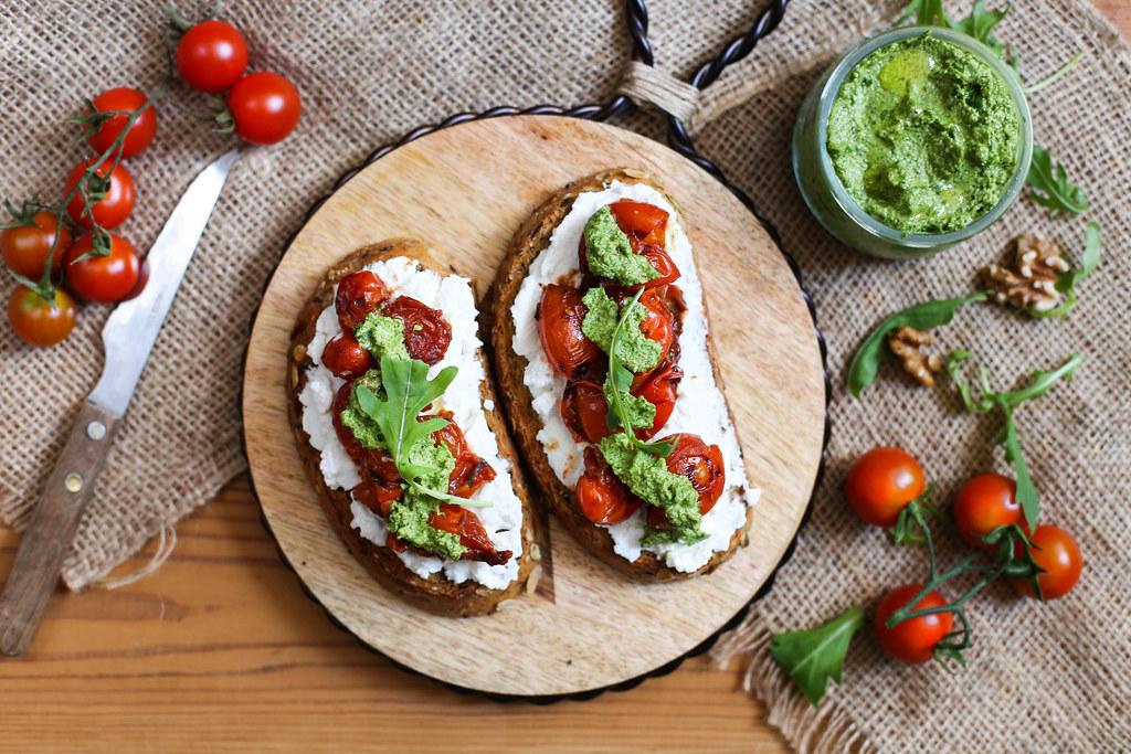 Mira la receta paso a paso aquí5. Tostadas con ricotta, tomates cherrys y pesto de rúcula