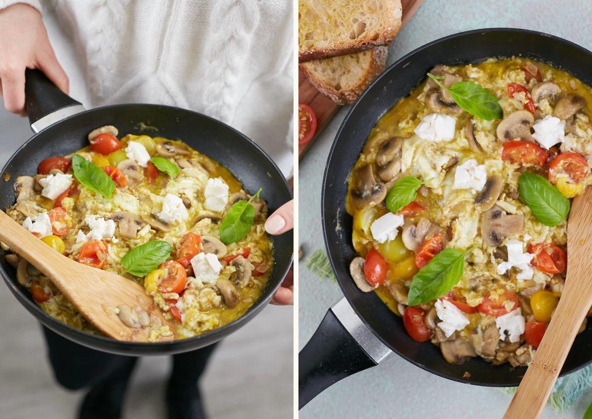 10. Paila de huevos con champiñones, tomates cherry y queso feta