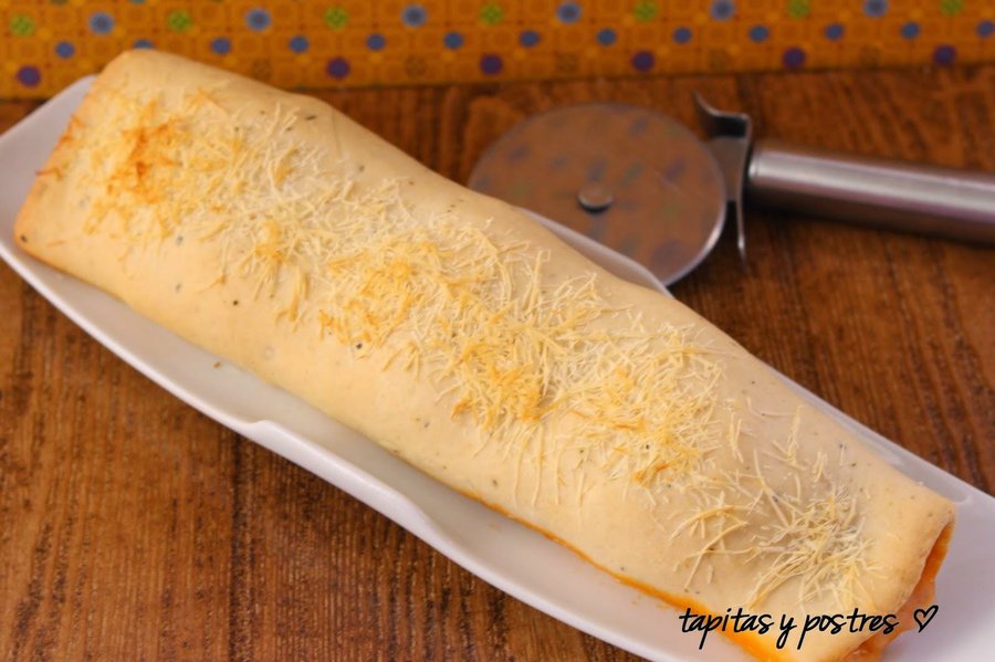 En el blog de Tapitas y Postres podemos encontrar una forma diferente de comernos una pizza. Hacemos primero una masa que se elabora con aceite, agua, levadura, harina y sal. Mezclamos y hacemos una bola que luego extenderemos. Colocaremos en la superficie tomate frito, jamón y queso. Enrollamos y espolvoreamos con queso. Llevamos al horno y servimos caliente. Puedes ver al detalle y paso a paso de su elaboración a continuación: