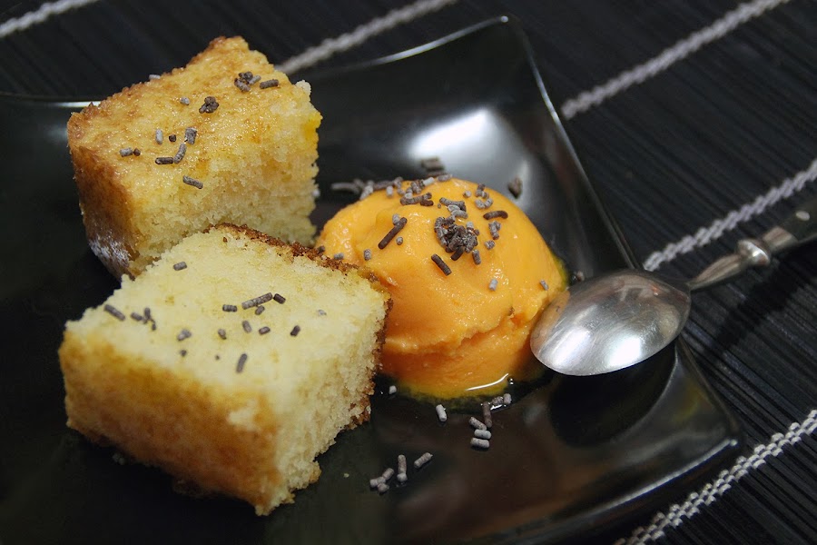 Este rico postre de bizcocho muy esponjoso con un sabor delicioso a naranja y ron, está acompañado con helado de naranja aunque también se le puede acompañar con una crema fresquita. Es un postre barato, fácil de hacer y riquísimo, es del blog Dvicio.