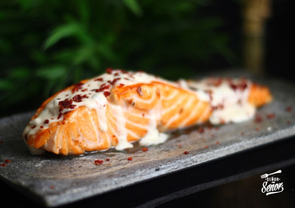 2.-Salmón fresco con salsa ligera de Gorgonzola y sal de jamón ibérico: