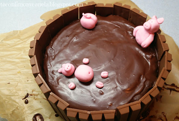 En cuanto a la cocina, como os he comentado dos de mis sobrinos cumplieron un año en marzo. Para Martita, quedé con mi hermana en hacerle una tarta. Después de pensar varias opciones de fondant rosa, me acordé de una que tenía ganas de hacer: la tarta de cerditos en el charco, y por ésa nos decidimos: