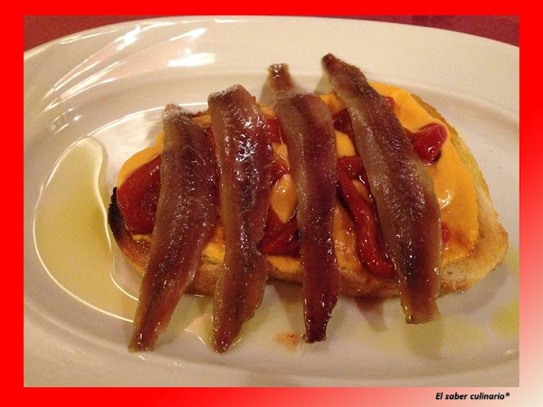 Prepara el salmorejo según la receta auténtica (pincha aqui). Se unta el panecillo con el salmorejo, acompañado de anchoa y unas tiras de pimiento del piquillo.