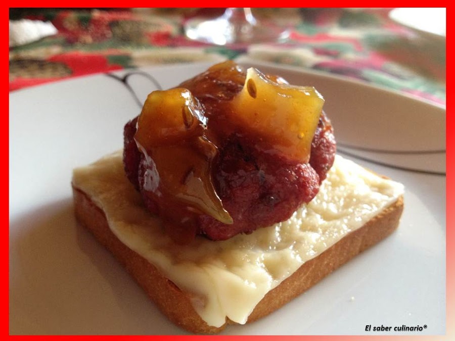 Para este canapé o tosta, el secreto está en la carne picada. Primero hay que pochar una cebolla y cuando esté lista se mezcla con la carne picada, con un majado de ajo y perejil y a todo esto le añadimos una cucharada sopera de tandoori (ver explicación del tandoori). Toda esa mezcla se deja marinar un par de horas en la nevera para a continuación hacer bolitas y aplastarlas a modo de mini-hamburguesas y hacerlas a la plancha. Para montar la tapa o canapé se pone el pan, a continuación una loncha de queso, encima la mini-hamburguesa y por último salsa de mango (se venden en tiendas orientales o sección de cocina internacional en grandes superficies).