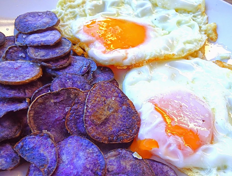 Xips de patates violeta amb ous ferrats - Chips de patatas violeta con huevos fritos