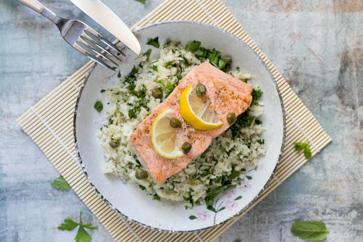 9. Arroz de coliflor y hierbas con salmón a la plancha