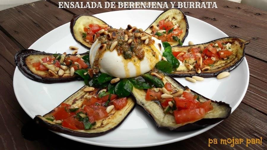 Una ensalada con sabores y aromas mediterráneos donde la berenjena se combina con tomates, anchoas, queso burrata y otros ingredientes. Una idea compartida por la autora del blog Pa mojan pan!