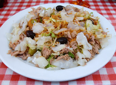 Esta deliciosa ensalada, cuya receta es típica de esta preciosa ciudad costera y diferentes comarcas del Penedés, costas de Garraf, y diversas poblaciones de Tarragona como Valls o El Vendrell. Esta ensalada esta aderezada con la salsa Romesco "el secreto de este plato" y que se elabora a mano el mortero.