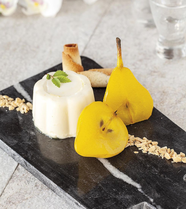 Tenemos un dulce canutillo de pasta filo relleno de frutas de temporada como granada y manzana. Para crear la masa tenemos que elaborar un relleno a base de frutas y queso de untar.PERAS EN ALMIBAR CON CÚRCUMA Y PANNA COTTA