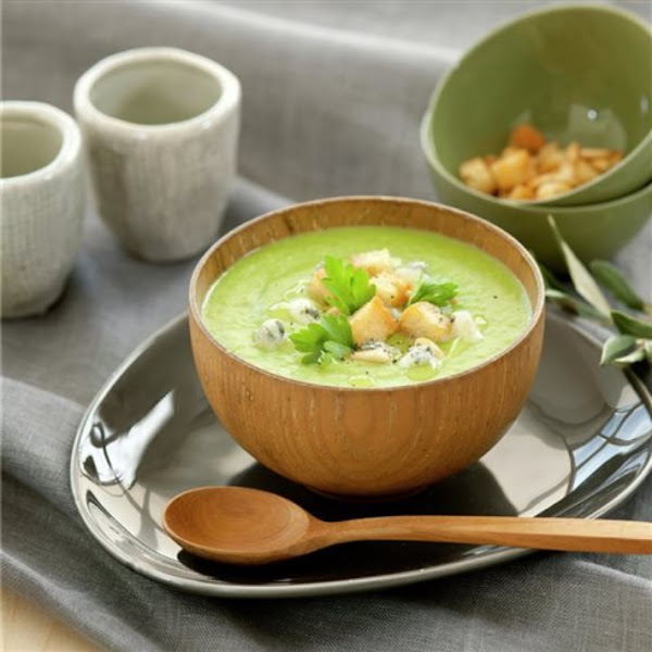 Esta apetitosa crema de guisantes, se prepara con mantequilla, puerro, patata y guisantes. Se sirve con piñones, pan tostado en el horno a daditos y queso gorgonzola.