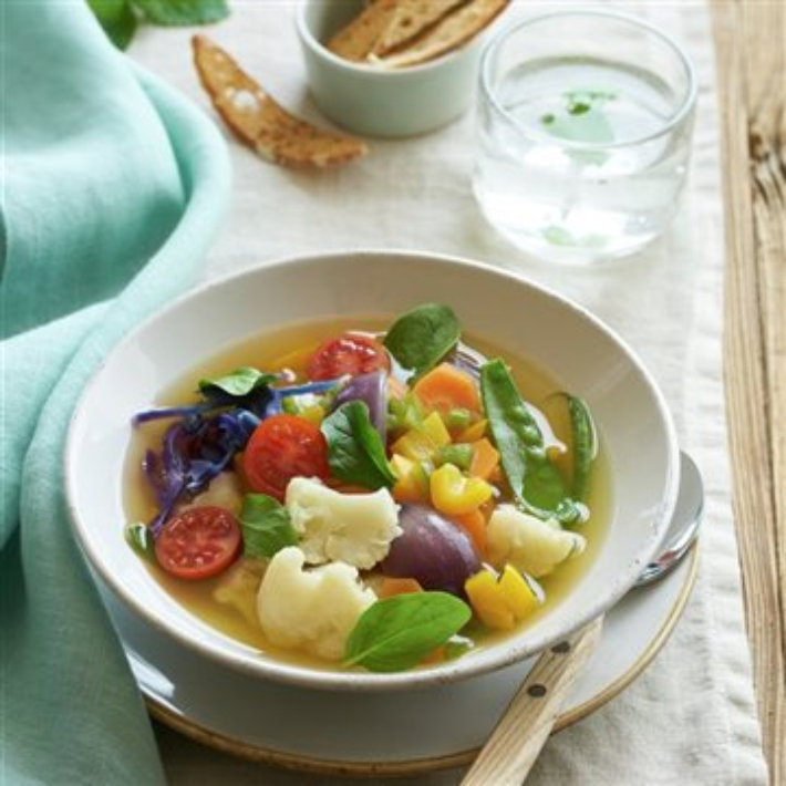 Las verduras son perfectas para añadir como ingredientes a cualquier receta. Si además están al dente para que conserven todas sus propiedades y sabor aún mejor. Aprende a elaborar esta sopa de verduras crujientes con los sabores y los colores de la col lombarda, pimiento amarillo, judías verdes......