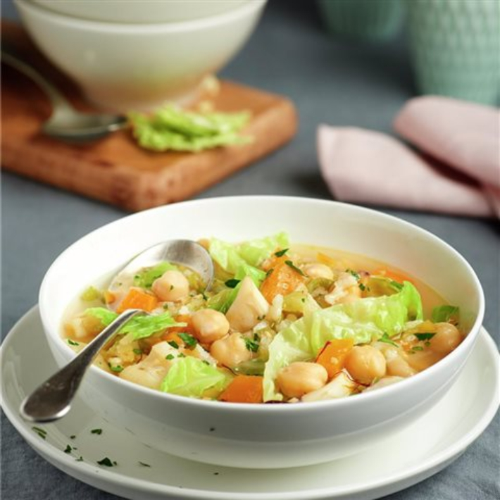 Mira qué original y qué completo nuestro guiso de hoy Es una sopa de garbanzos con verdura (cebolleta, apio, zanahoria, repollo, calabaza...), sepia en daditos y arroz.