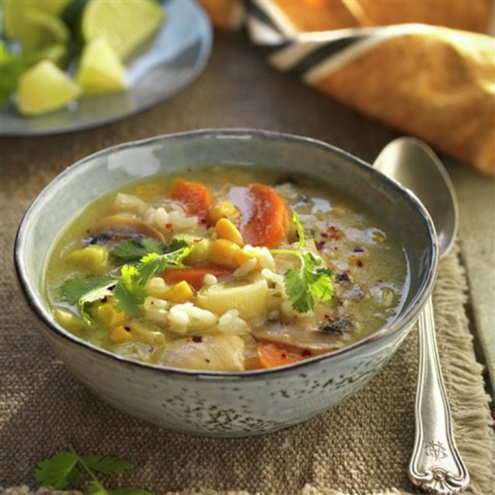 ¿Te apetece un toque un poco exótico en la sopa? Esta sopa thai lleva zanahoria, jengibre, puerro, patata, champiñones, maíz, pollo y leche de coco........Si te gusta la comida con un toque asiático esta es perfecta para entrar en calor.