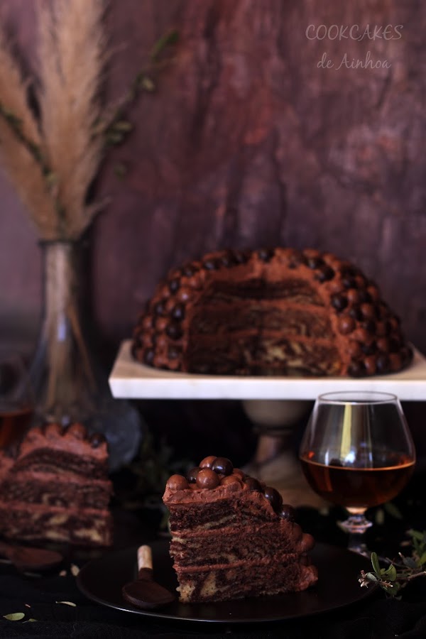 Mi receta dulce para esta celebración tan especial es una Layer Cake con forma de cúpula elaborada con la técnica de efecto cebra, es decir, combinando bizcocho de vainilla y de chocolate. Todo ello relleno y cubierto de una deliciosa trufa de chocolate negro que, junto al toque crujiente de las bolas de cereal, forman un equipo insuperable!