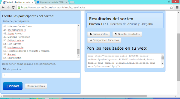 Enhorabuena a las ganadoras: 41. Recetas de Azúcar y Orégano. Nos podremos en contacto con vosotras.