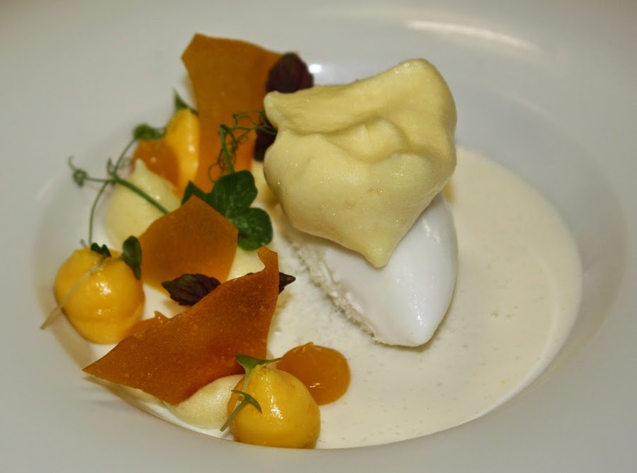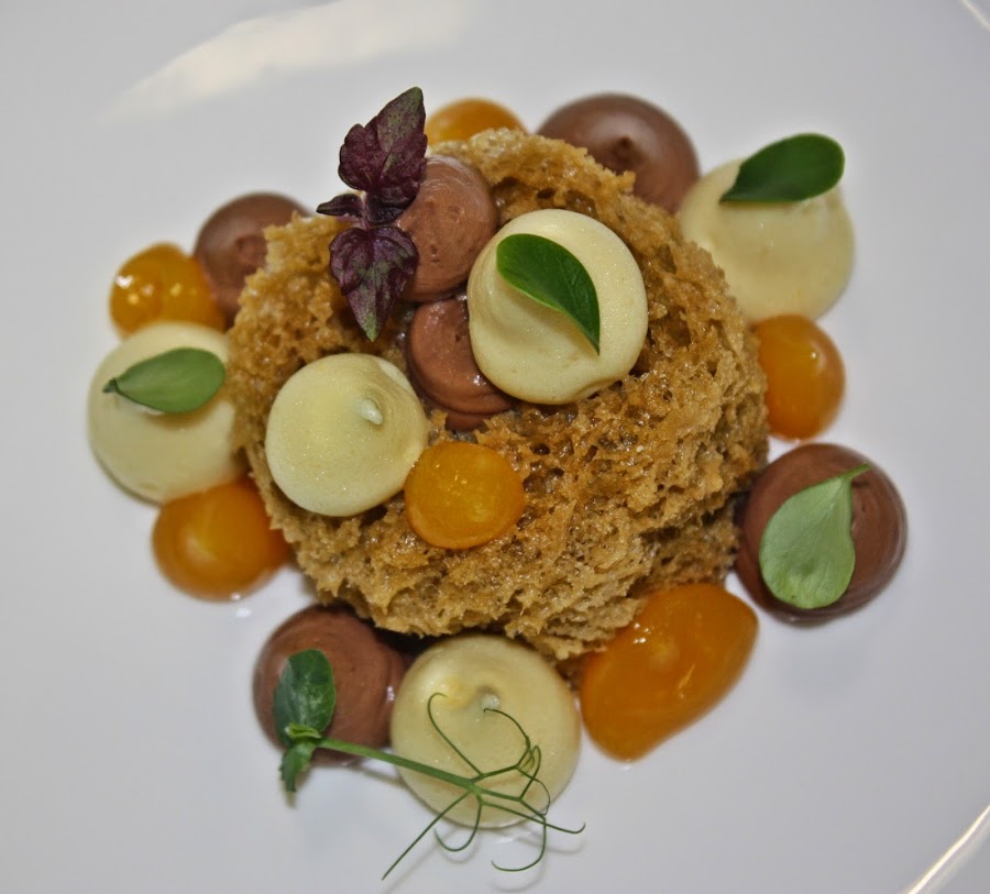 Bizcocho esponjoso de avellana con mousse de glanduja, espuma de fruta de la pasión y gelatina de mango