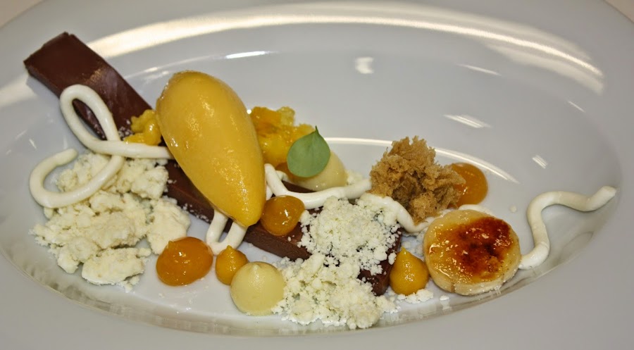 Flexi ganache de chocolate con fruta de la pasión, sorbete de mango, polvo de chocolate blanco, plátano caramelizado, cremeux de mango