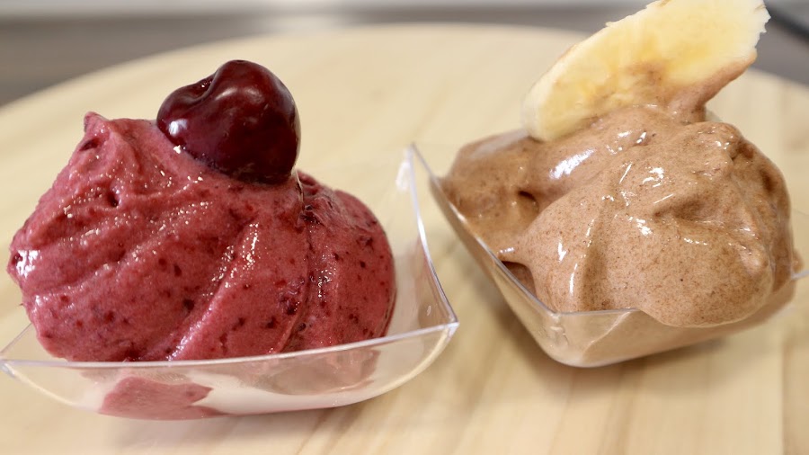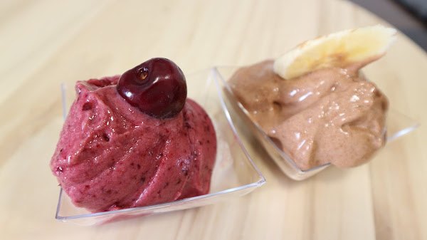 Y si te digo que puedes preparar helados a base de fruta sin azúcar y sin grasa?? Parece una locura puesto que ya sabemos que la mayoría de helados están cargados de azúcar y grasas, hoy quiero enseñarte a prepararlos, se hacen en poco tiempo y es una manera genial de comer fruta, ya me contarás cual te ha gustado mas si el de cerezas y yogur o el de plátano y cacao.