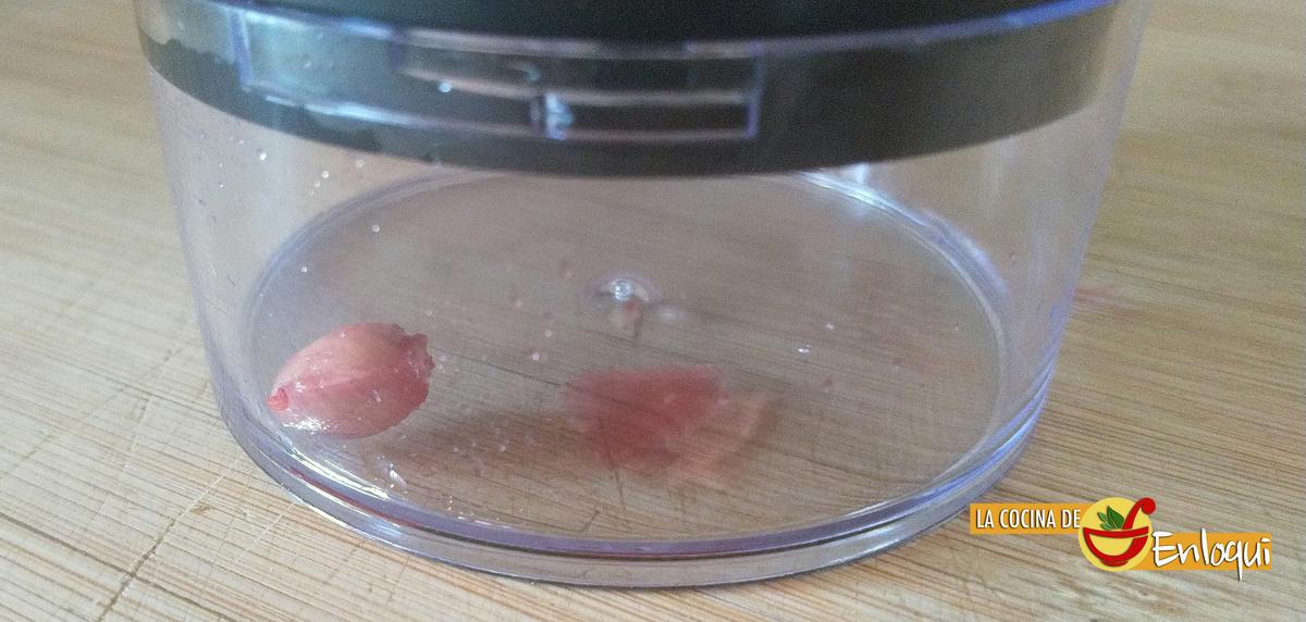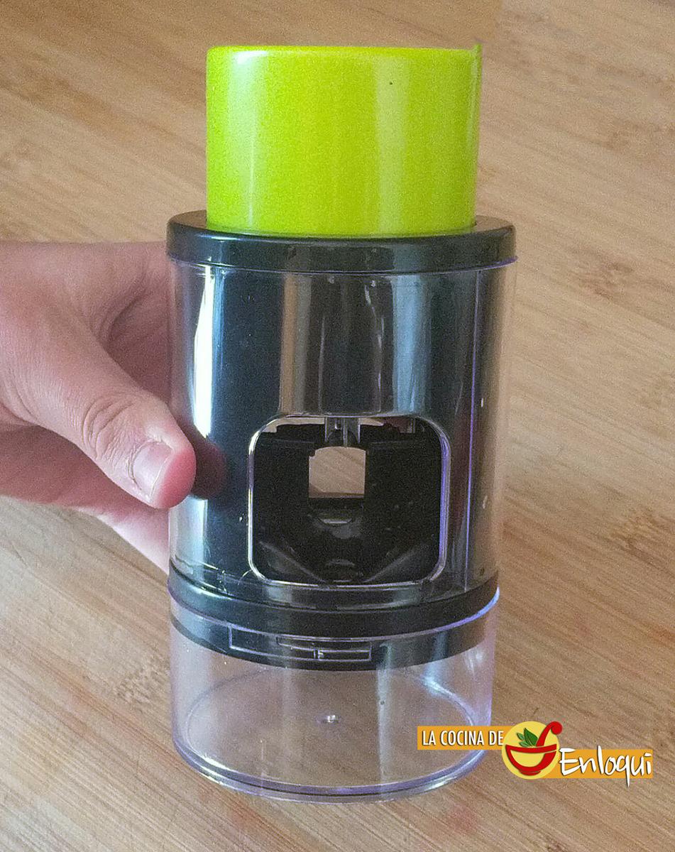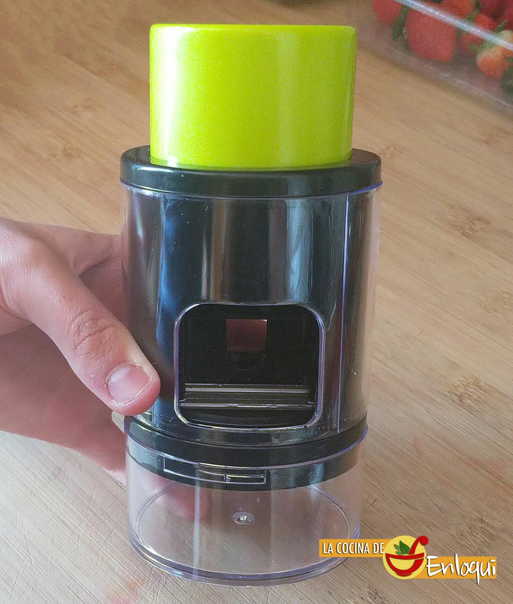 En mi caso estoy utilizando este deshuesador. Es muy práctico y versátil ya que es un dos en uno. Por un lado deshuesa aceitunas y por el otro corta en láminas pequeñas piezas de fruta como por ejemplo, fresas.