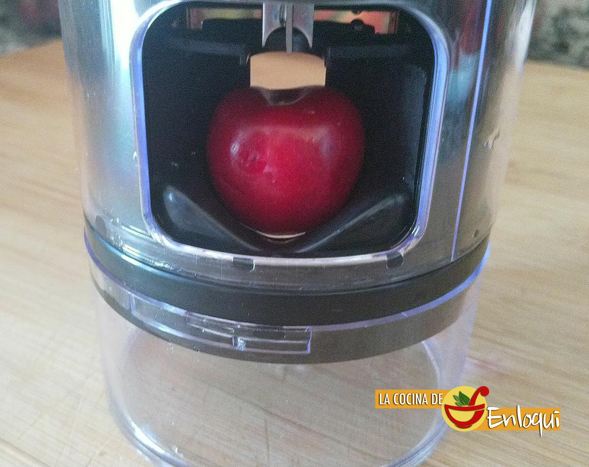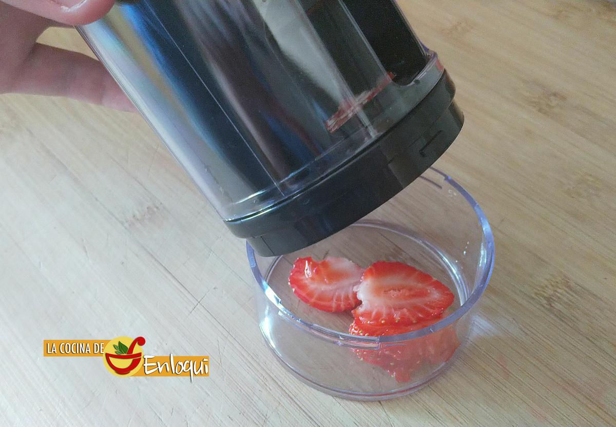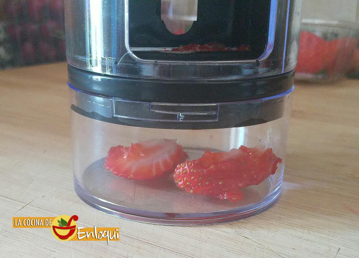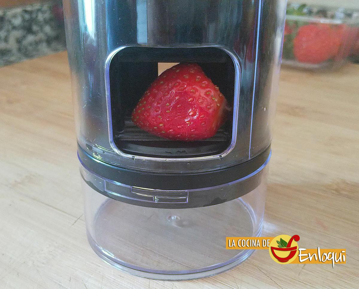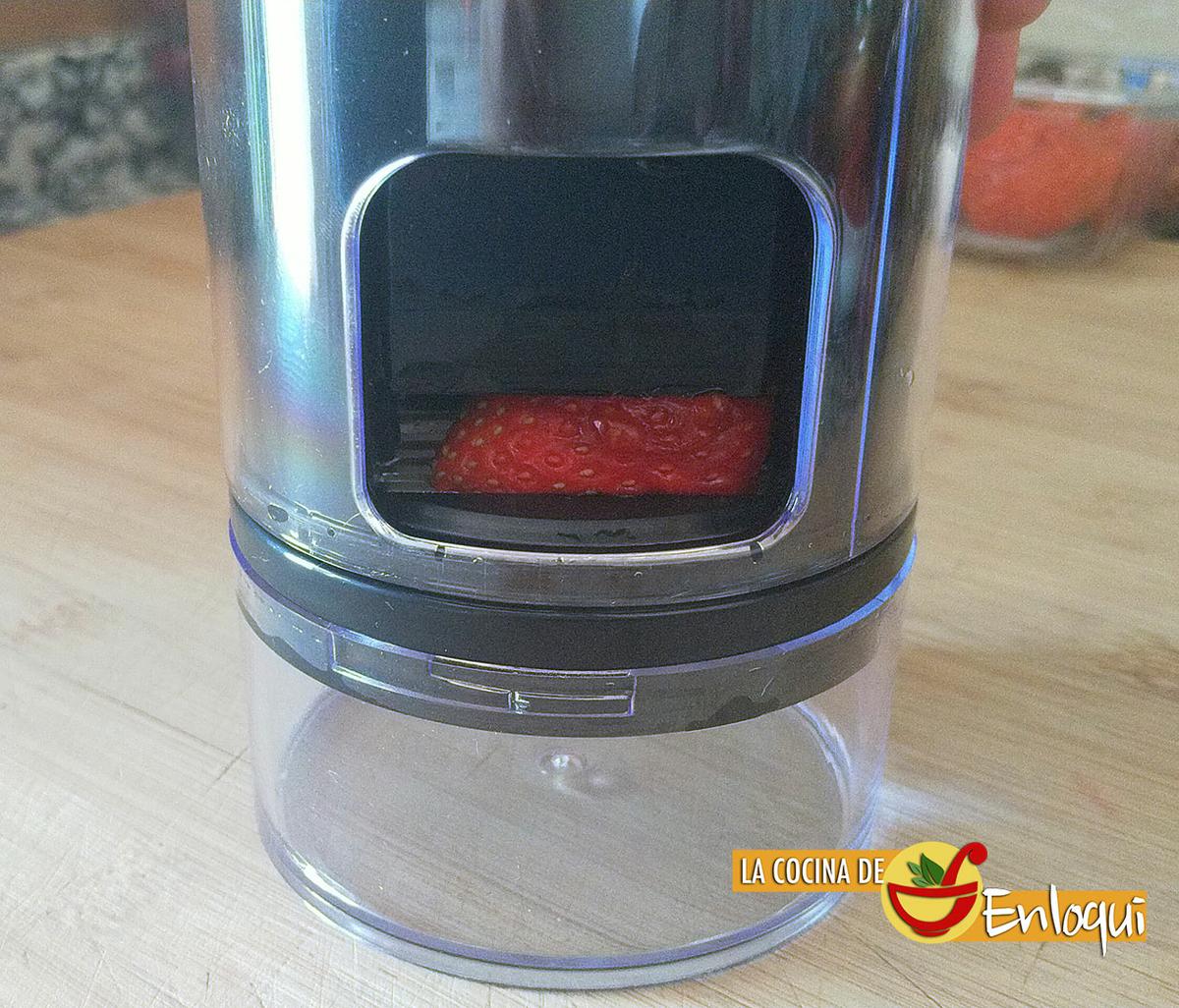 Como te decía anteriormente, este accesorio también te permite cortar en láminas pequeñas piezas de fruta. El funcionamiento es el mismo. Retira el tallo de la fresa introdúcela en el orificio. Presiona hacia abajo y la fruta cae cortada en láminas al recipiente de la base.Si tú utilizas otro método y quieres compartirlo con nosotros estaremos encantados de leerte en comentarios. También puedes compartir tus fotos o vídeos en redes sociales y no olvides etiquetarnos para que los podamos ver, nos hace mucha ilusión.