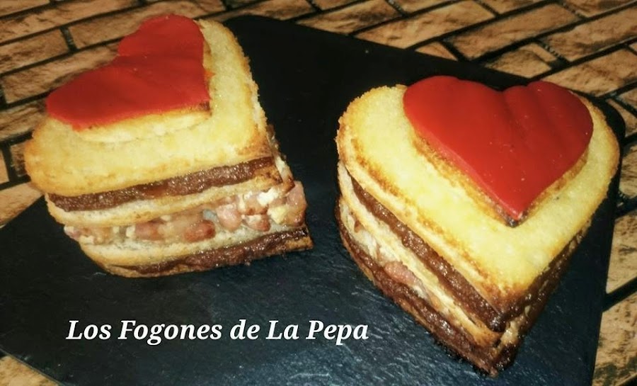 Seguimos con la creación de Pepi Rojas. Corazones de sandwich de bacon, queso cabra, mousse de pato y crema de cebolla y manzana caramelizada.